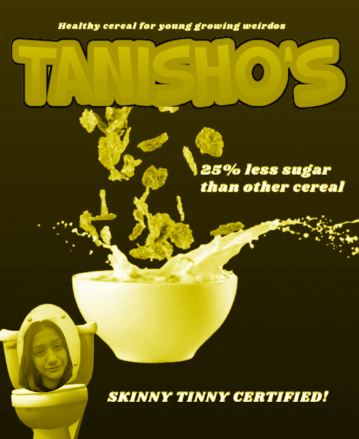 TanishO's (Original) Healthy cereal for young growing weirdos 25% less sugar than other cereal SKINNY TINNY CERTIFIED! ONLY $4,500 per crumb (5 crumbs included) Buy now, before it sells out! $22,500 per box! FREE SHIPPING!!!!